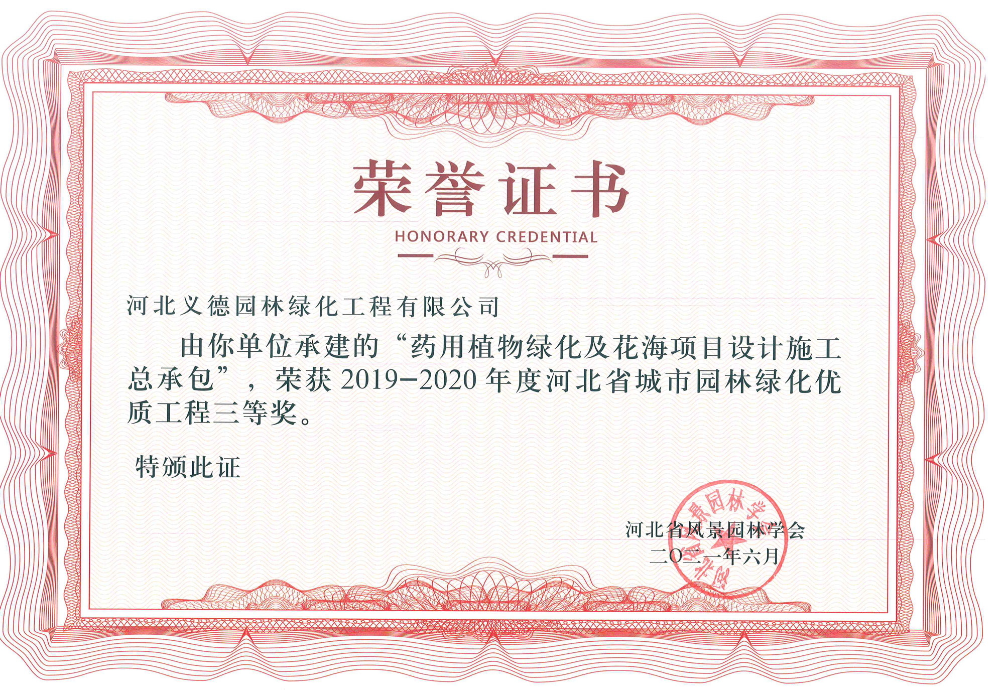 工程業績榮獲有2017-2018年度河北省城市園林綠化優質工程二等獎兩個;2019-2020年度河北省城市園林綠化優質工程二等獎兩個、三等獎兩個;2018至2020年保定市燕趙杯優質工程五個;2020年度石家莊市優質工程一個。